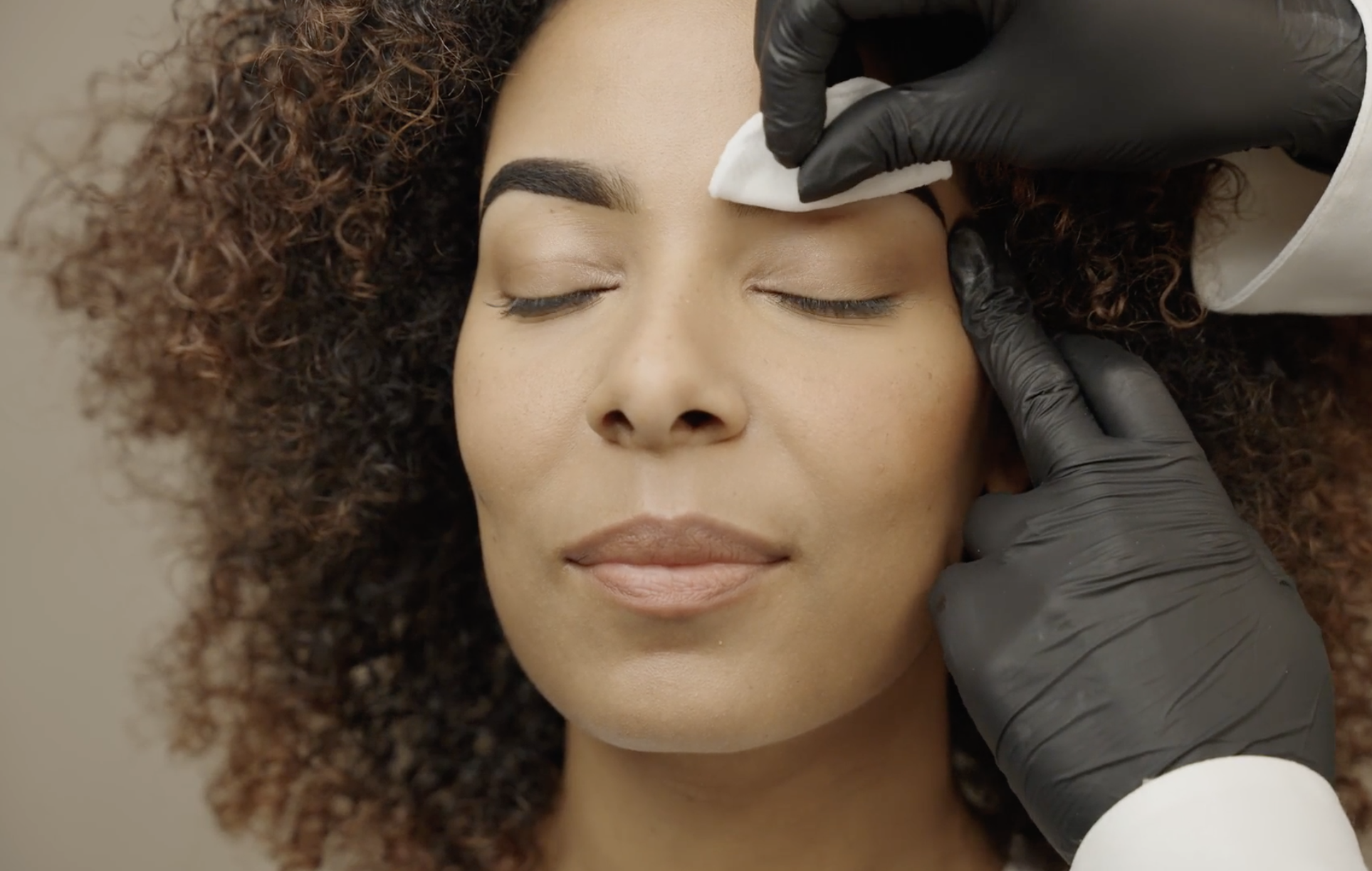 De wenkbrauwen worden gelift en de haartjes in de juiste richting geplaatst, inclusief threading en kleuren.
